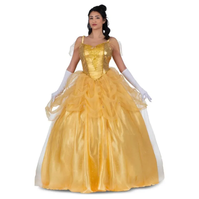 Transpórtate a un mundo de magia y encanto con este Disfraz de Princesa Bella en un hermoso color amarillo. Este elegante conjunto incluye un vestido largo con detalles dorados y ondulaciones en la falda que añaden volumen y sofisticación, perfecto para recrear el icónico look del baile. Los guantes blancos complementan el atuendo con un toque de elegancia, mientras que la enagua asegura que el vestido mantenga su forma espectacular durante toda la velada.