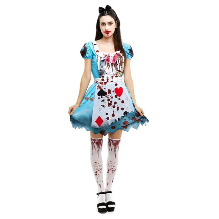 El vestido muestra detalles de manchas y efectos desgarrados que evocan una apariencia de zombie auténtica. Los volantes y el diseño de corazones y cartas añaden un toque único que se mantiene fiel al espíritu de Alicia. El disfraz incluye una elegante diadema negra con un lazo que completa el look tenebroso.