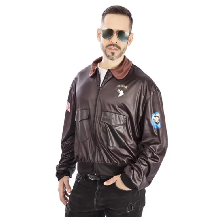 Despega hacia la aventura con este impresionante disfraz de aviador para hombre. La pieza central es una chaqueta de estilo aviador fabricada en un material que imita la piel, con un acabado en color marrón oscuro. Destacan los detalles como las insignias bordadas, que aportan un toque auténtico al estilo militar. La chaqueta incluye prácticos bolsillos frontales y un cierre de cremallera que facilita su uso. El cuello está diseñado en un tono marrón más claro, añadiendo un contraste elegante y distintivo.