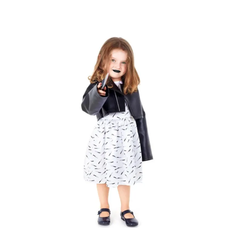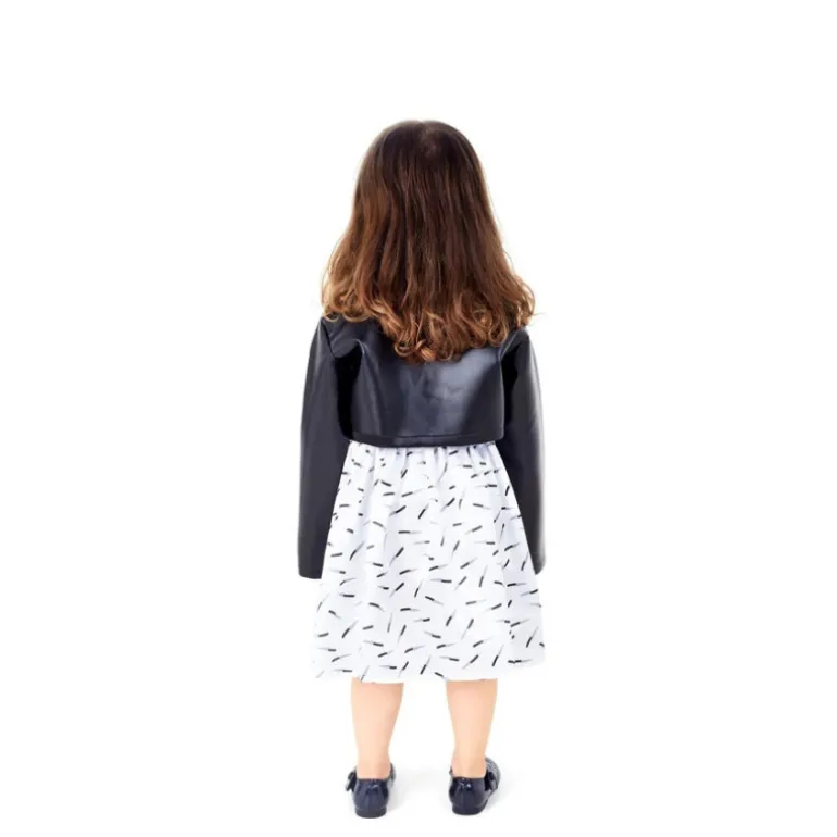 Este encantador disfraz para bebé combina elementos oscuros y juguetones, ideal para el próximo Halloween o cualquier evento temático. El conjunto incluye un vestido blanco con divertido estampado de pequeños trazos en negro que aporta un toque original y moderno. La chaqueta negra, inspirada en un estilo rockero, completa el atuendo con un aire desafiante y a la moda.