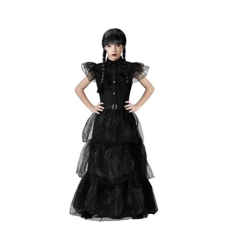 Este disfraz de baile para niña es perfecto para las pequeñas que desean un look siniestro y encantador. El conjunto incluye un vestido negro con volantes de encaje en las mangas y en las diferentes capas de la falda, aportando un toque elegante y misterioso. El diseño resalta con un cinturón a juego que ajusta la cintura, realzando el estilo gótico del disfraz.
