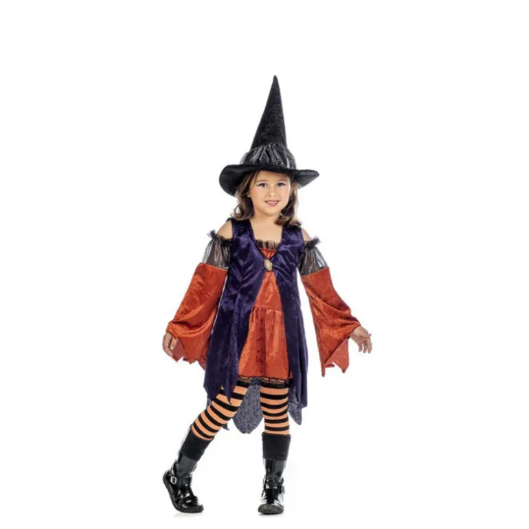 Disfraz de Bruja, Brujita o Hechicera Naranja para niña. Incluye vestido y sombrero. No incluye medias ni calzado. Alta calidad, hecho en España. ¡Apoya el comercio español comprando En !