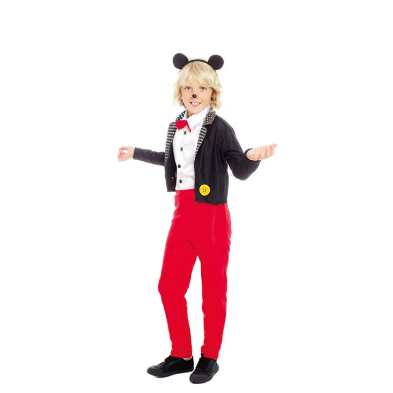 Transforma a tu pequeño en el icónico personaje de Disney con este encantador disfraz de Mickey Mouse. El conjunto incluye una elegante chaqueta negra con solapas de cuadros, una camisa blanca simulada con un lazo rojo, y unos llamativos pantalones rojos, recreando a la perfección el clásico look de Mickey. La diadema con orejas negras completa este look mágico. Este disfraz es ideal para fiestas, Halloween o simplemente para disfrutar de un día de juegos imaginativos.