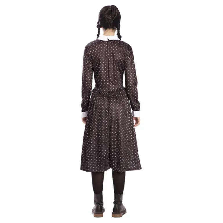 Sumérgete en un estilo oscuro y sofisticado con este disfraz de niña gótica para mujer. El conjunto incluye un encantador vestido de color negro adornado con pequeños puntos blancos, que resaltan su diseño clásico y atemporal. El vestido se caracteriza por su corte midi, ajustado en la cintura para definir la silueta, y con un cuello y puños blancos que le dan un toque distintivo.
