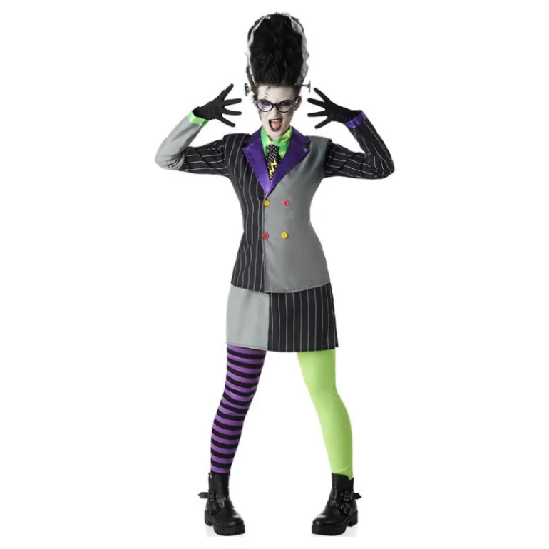 Transforma tu estilo con este impresionante disfraz de Novia Frankenstein a rayas para mujer. Este conjunto único incluye una chaqueta gris con detalles de rayas negras y botones de colores vibrantes, aportando un toque moderno y llamativo. La pechera verde lima y la corbata a juego añaden un contraste visual impactante, mientras que los leggings de rayas púrpura y negro, combinados con el verde sólido, ofrecen un look dinámico y sorprendente.