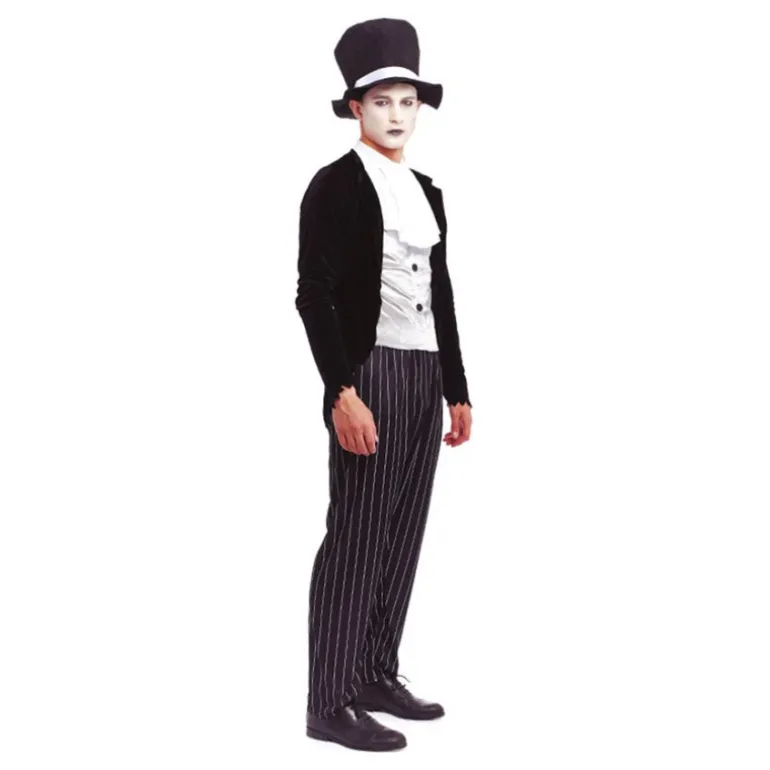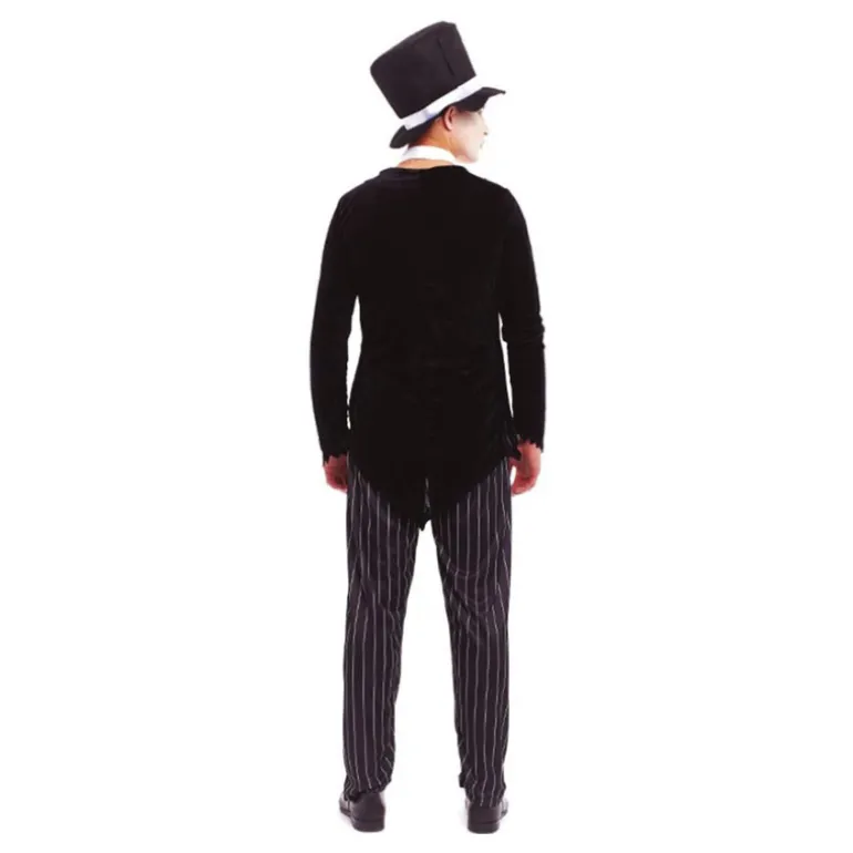 Transforma cualquier evento en una ocasión memorable con este disfraz de Novio Cadáver para hombre. El conjunto incluye un elegante sombrero negro de copa alta que aporta un toque clásico y misterioso al look. La camiseta blanca simula un chaleco con chorrera, proporcionando un aspecto detalladamente elaborado que complementa el atuendo.