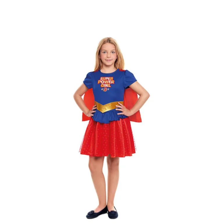 Transforma a tu pequeña en una heroína con este encantador disfraz de Supergirl para niña. El conjunto incluye un elegante vestido con vuelo en vibrante color azul y rojo, adornado con un llamativo logotipo de «Super Power Girl» en el pecho. La prenda incorpora un cinturón dorado que realza la cintura, aportando un toque distinguido.