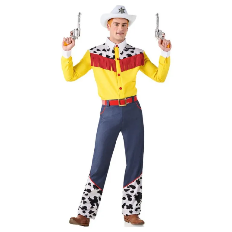 Transforma en el auténtico vaquero del Lejano Oeste con este disfraz de Woody para hombre. Este conjunto cuidadosamente diseñado incluye una camisa de color amarillo brillante con detalles en rojo y un estampado de vaca en la parte superior, capturando perfectamente la esencia del querido personaje de Toy Story. Los pantalones azules complementan el look, adornados con detalles que imitan las chaparreras de cuero, ofreciendo así un toque distintivo. El disfraz se completa con un cinturón rojo con hebilla dorada, dándole un acabado pulido y autentico.