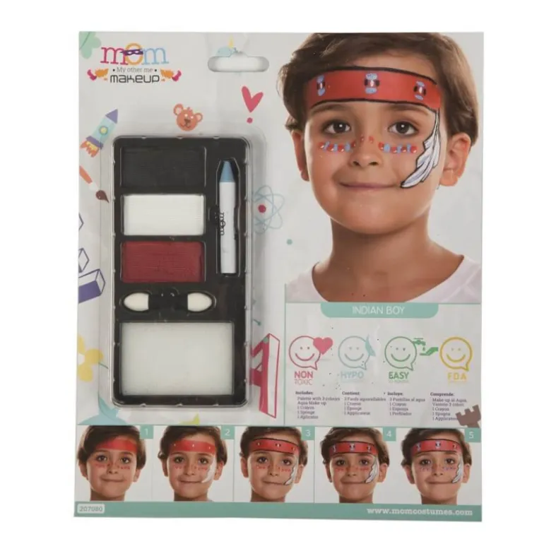 Kit de Maquillaje de Indio infantil. Incluye Paleta con 3 colores al agua, 1 crayón, 1 esponja, 1 perfilador y guía paso a paso. ¡Con un poco de maquillaje tu disfraz mejorará mucho!