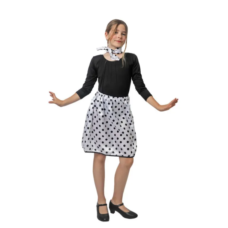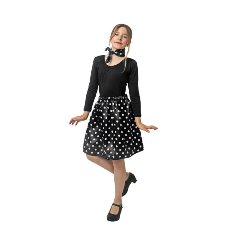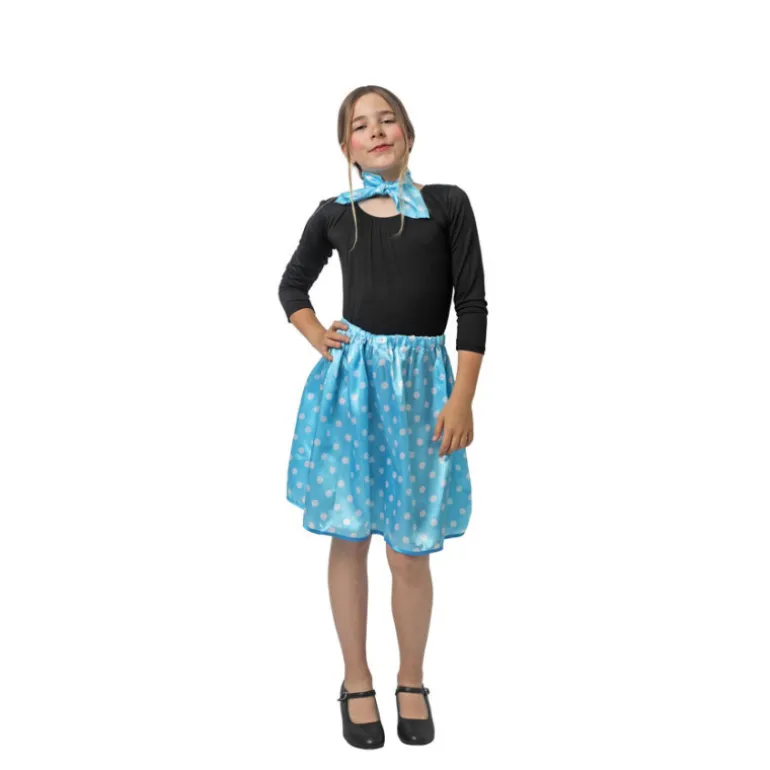 Descubre el kit de vestuario de los años 50 diseñado especialmente para niñas, perfecto para recrear el estilo retro con elegancia y diversión. Este conjunto incluye un pañuelo y una falda, ambos confeccionados en rasete, un tejido suave y brillante que aporta un toque de autenticidad a cualquier disfraz o fiesta temática.