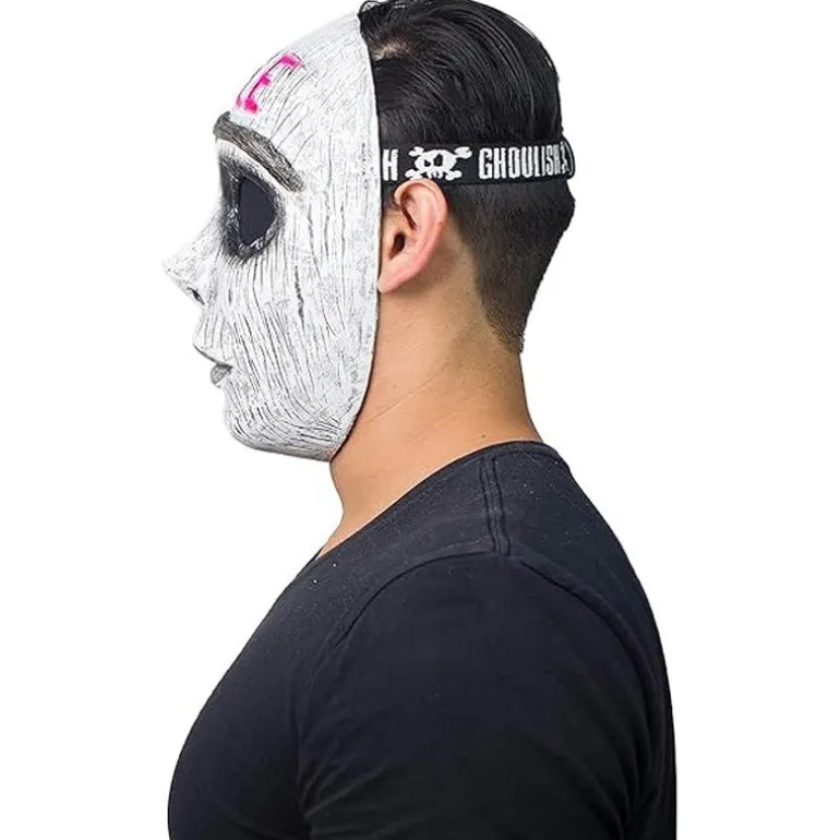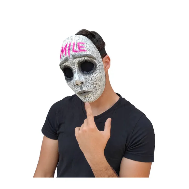 Descubre esta máscara única y llamativa, diseñada para los amantes del cosplay y los disfraces. Este intrigante accesorio presenta un diseño de cara sonriente con llamativos detalles en neón rosa que forman la palabra «Smile» en la parte superior. La textura imita un acabado de madera desgastada, dándole un aspecto misterioso y escalofriante, perfecto para cualquier evento de disfraces o festival.