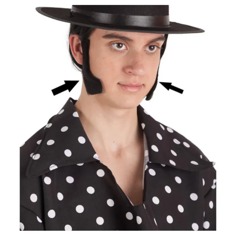 Patillas largas color negro. Son perfectas para acompañar a disfraces nuestros que tenémos en , como el Cordobés, el del inigualable Chiquito de la Calzada, los disfraces de Rockero o de Elvis y de los años 60, 70 y 80. ¡compra en , será divertido!