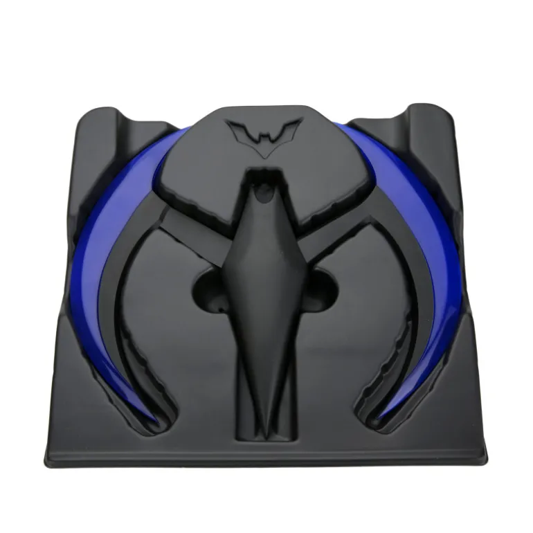 El Batarang, de aproximadamente 20 cm, cuenta con iluminación LED azul en las alas que se puede encender o apagar. Funciona con 3 pilas de botón que vienen incluidas.